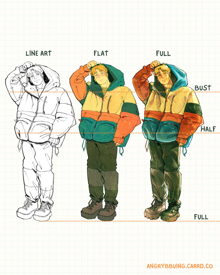 • All commissions are digital goods only. No physical item(s) will be shipped to you, unless previously agreed upon.• Commissions are for Personal Use only and cannot be used for profit. If you'd like to commission me for commercial work, please fill-out the Commission Form accordingly.• Make sure you communicate with me and don't ghost me. If I ask for corrections, and I don't have a response from you within 5 business days (unless you let me know what's going on beforehand), I will refund you the amount equivalent to the stage of the process I am at.• I am allowed to post your commission on my social media and use it in my portfolio unless you opt out when filling out the Commission Form. But if you decide to put it online, I am allowed to use it in my portfolio.• You are allowed to post and use the art you have commissioned as an icon and header, but only with credit (@angrybbuing).• I'll send your final commission (Google Drive link) via the communication method you choose in the Commission Form. One high-res version with no watermark for your personal use, and a lower-res one with a watermark for you to post online. You cannot post the unwatermarked versionI clean up the files in my Google Drive at the end of the year for more storage, so please, make sure you save and download the files before they are removed.• I DO NOT ALLOW ANY OF MY ARTWORKS AND COMMISSIONS TO BE USED FOR CRYPTO, BITCOIN, NFT, OR ANY TYPE OF CRYPTO CURRENCY TRANSACTION.• I DO NOT ALLOW ANY OF MY ARTWORKS AND COMMISSIONS TO BE USED FOR ANY AI PURPOSES. DO NOT UPLOAD MY WORK TO ANY AI SITES FOR ANY REASON; USING MY WORKS FOR AI TRAINING/DATABASES/MODELS IS PROHIBITED.